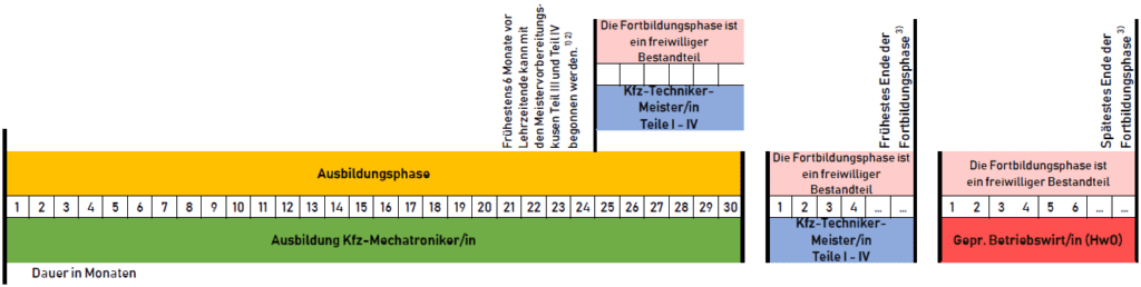 ¹Nur wenn man ein entsprechendes Angebot findet. ²Die Prüfungsteilnahme ist erst nach der erfolgreich abgelegten Gesellenprüfung möglich. ³Das Ende der Fortbildungsphase ist von folgenden Punkten abhängig: Ob noch während der Ausbildung mit der Fortbildung begonnen wurde; der Wartezeit zwischen dem Lehrzeitende und den anschließenden Fortbildungsschritten; der Dauer der einzelnen Fortbildungsschritte; einer eventuellen Weiterqualifizierung zum/zur Gepr. Betriebswirt/in (HwO) und der Dauer des Kurses; ob die Teilzeit-, Vollzeitform oder eine Mischung aus beidem gewählt wurde, da es für alle Teile der Fortbildung Teilzeit- und Vollzeitangebote gibt.